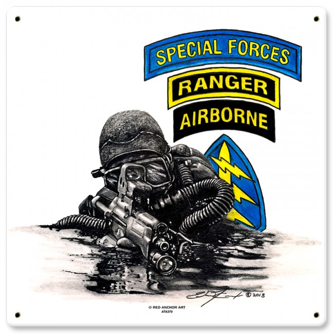 Special Forces Diver by Red Anchor Art Metal Sign measures 12 inches by 12 inches and weighs in at 3 lb(s). This custom metal shape is hand made in the USA using heavy gauge American steel and a process known as sublimation, where the image is baked into a powder coating for a durable and long lasting finish. This custom metal shape is drilled and riveted for easy hanging.