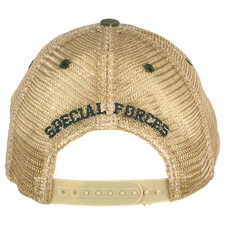 Embroidered US Army Special Forces Logo on a vintage style trucker cap with softened mesh to keep your head happy. Snap back, one-size-fits-all.