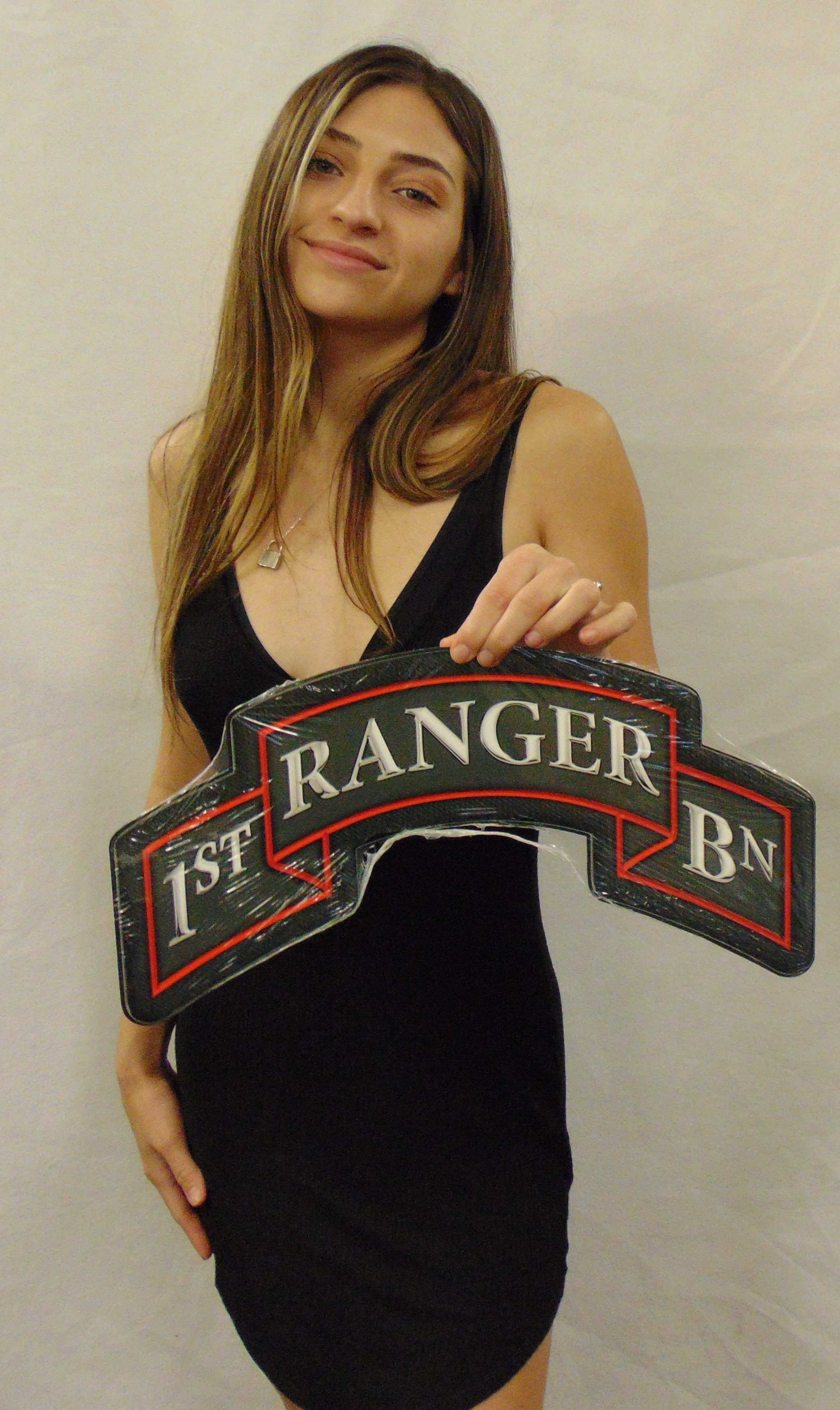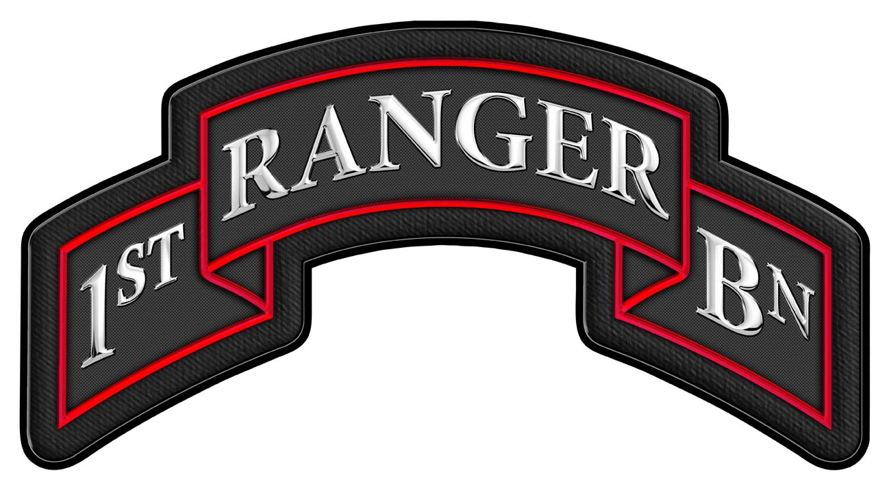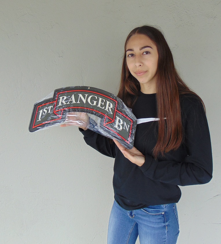 1st Ranger Battalion Tab Metal Sign- All Metal Sign 17 x 9". We hand make all of our custom metal shapes in the USA using heavy gauge american steel and a process known as sublimation, where the image is baked into a powder coating for a durable and long lasting finish. This custom metal shape is drilled and riveted for easy hanging.