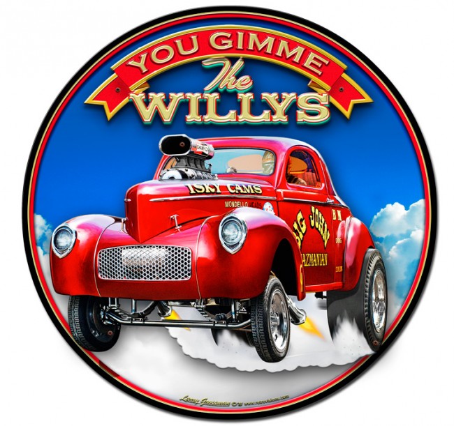 From the Larry Grossman Signs licensed collection, this 3 D Gimme the Willys 3D-Metal Signs measures 19 inches by 19 inches and weighs in at 4 lb(s). This 3D-Metal Signs is hand made in the USA using heavy gauge american steel and a process known as sublimation, where the image is baked into a powder coating for a durable and long lasting finish.