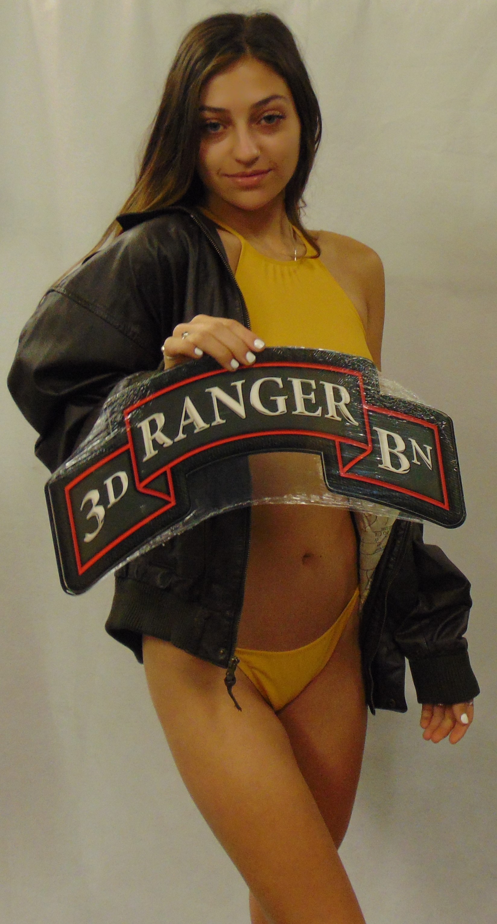 3rd Ranger Battalion Tab Metal Sign- All Metal Sign 17 x 9". We hand make all of our custom metal shapes in the USA using heavy gauge american steel and a process known as sublimation, where the image is baked into a powder coating for a durable and long lasting finish. This custom metal shape is drilled and riveted for easy hanging.