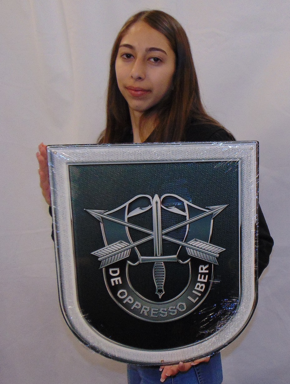 From Special Operations Group, presented by "Military Insignia 3D" collection by Serge Averbukh, this custom 15th Special Forces (SF) Group (POST BLACK FLASH) Airborne all metal Sign 15 x 18" inches and weighs in at 2 lb(s). We hand make all of our custom metal shapes in the USA using heavy gauge american steel and a process known as sublimation, where the image is baked into a powder coating for a durable and long lasting finish. This custom metal shape is drilled and riveted for easy hanging.