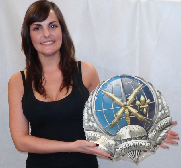 From Special Operations Group, presented by "Military Insignia 3D" collection by Serge Averbuk, this Air Force Special Operations Weather Medal Sign measures 16 inches high. This custom metal shape is hand made in the USA using heavy gauge American steel and a process known as sublimation, where the image is baked into a powder coating for a durable and long lasting finish. This custom metal shape is drilled and riveted for easy hanging.