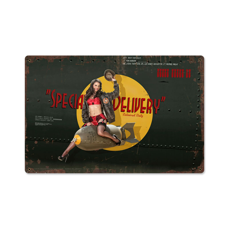 From the Wings of Angels licensed collection, this Special Delivery metal sign measures 18 inches by 12 inches and weighs in at 2 lb(s). We hand make all of our metal signs in the USA using heavy gauge american steel and a process known as sublimation, where the image is baked into a powder coating for a durable and long lasting finish. This metal sign is drilled and riveted for easy hanging.