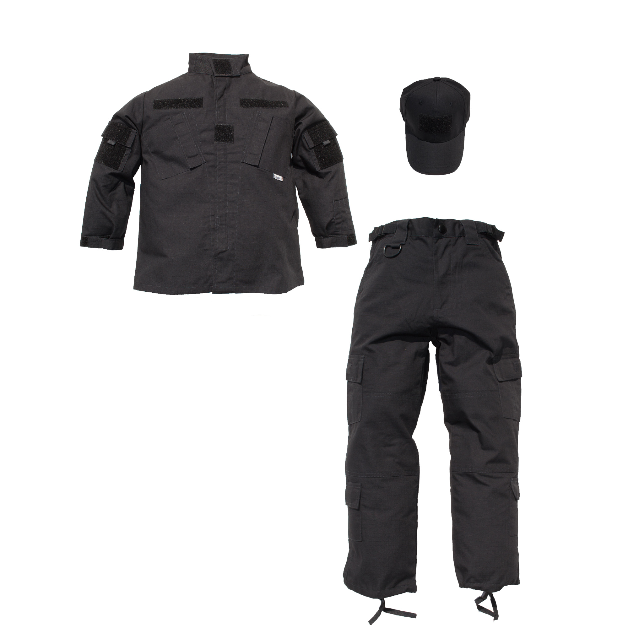 Trooper Tactical uniform is the most elite uniform Trooper has to offer for future law enforcement. It includes all of the details of the official SWAT and Tactical Police uniforms. The 7.5 oz rip-stop uniform is durable enough for the most rugged conditions. Zippered top features four pockets, Velcro wrist fasteners, large 11″X 3″ Velcro panel on the back holds unit name. (*Police/ SWAT/ FBI patches sold separately.) Also includes Velcro mandarin collar. Rank hook and loop allow for morale patches, name tapes and rank to be applied to this uniform. Pants feature double knee and double seat reinforced with eight pockets, size adjustment tabs and drawstring bottoms with belt loops and D-ring. Set also includes patrol cap with hook and loop on the front and back for customization. Get this uniform on your future door kicker today. Go with the brand you can trust…Trooper Clothing.