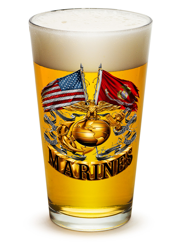 DOUBLE FLAG GOLD MARINE CORPS PINT GLASS