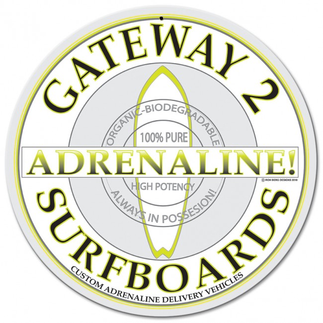 Gateway 2 Adrenaline Surfboards round measures 14 inches by 14 inches and weighs 1lb(s). This sign is hand made in the USA using heavy gauge American steel and a process known as sublimation, where the image is baked into a powder coating for a durable and long lasting finish.