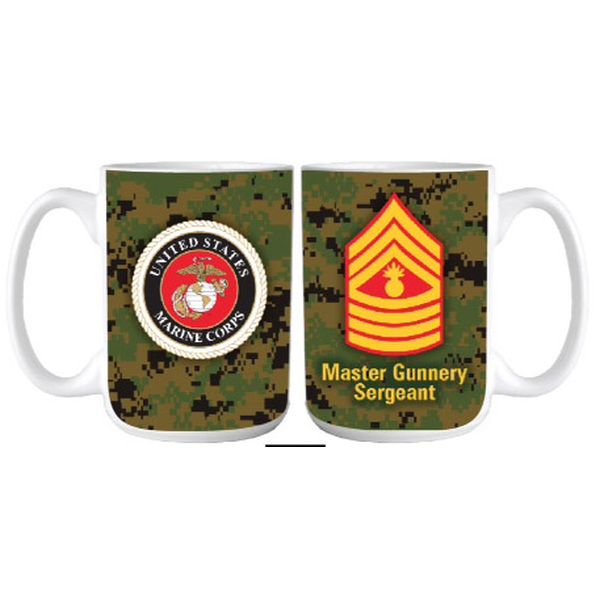 Marine Corps Emblem and E-9 MGySgt with Digital Pattern Full Color Sublimation on White 15oz. Mug