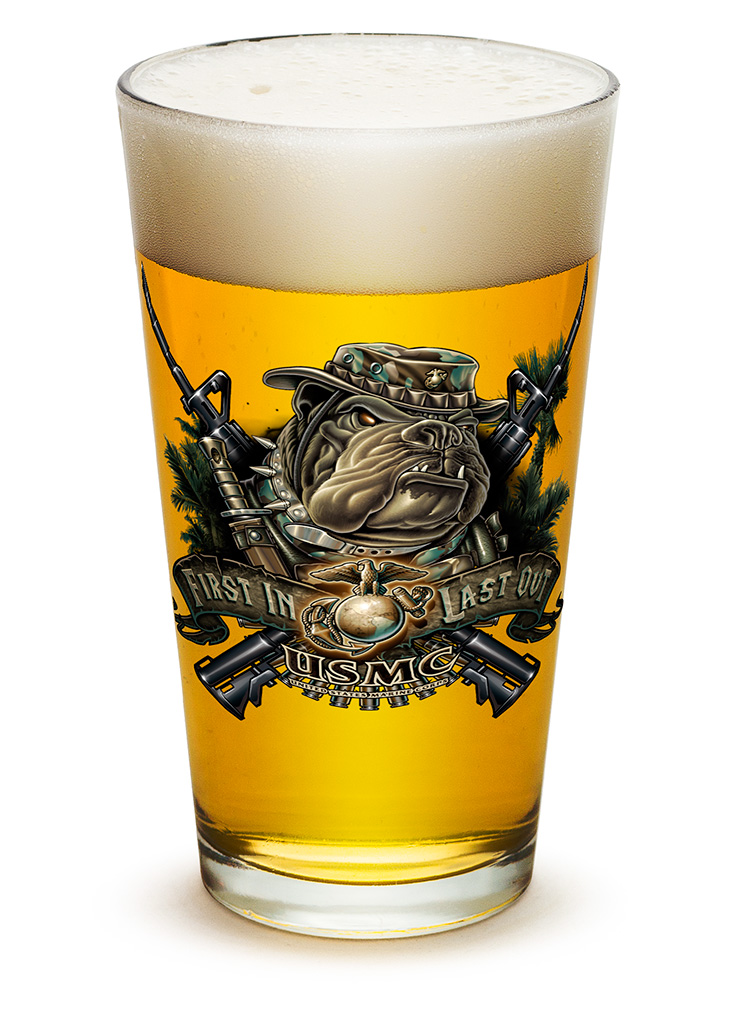 MARINE DEVIL DOG FIRST IN LAST OUT PINT GLASS