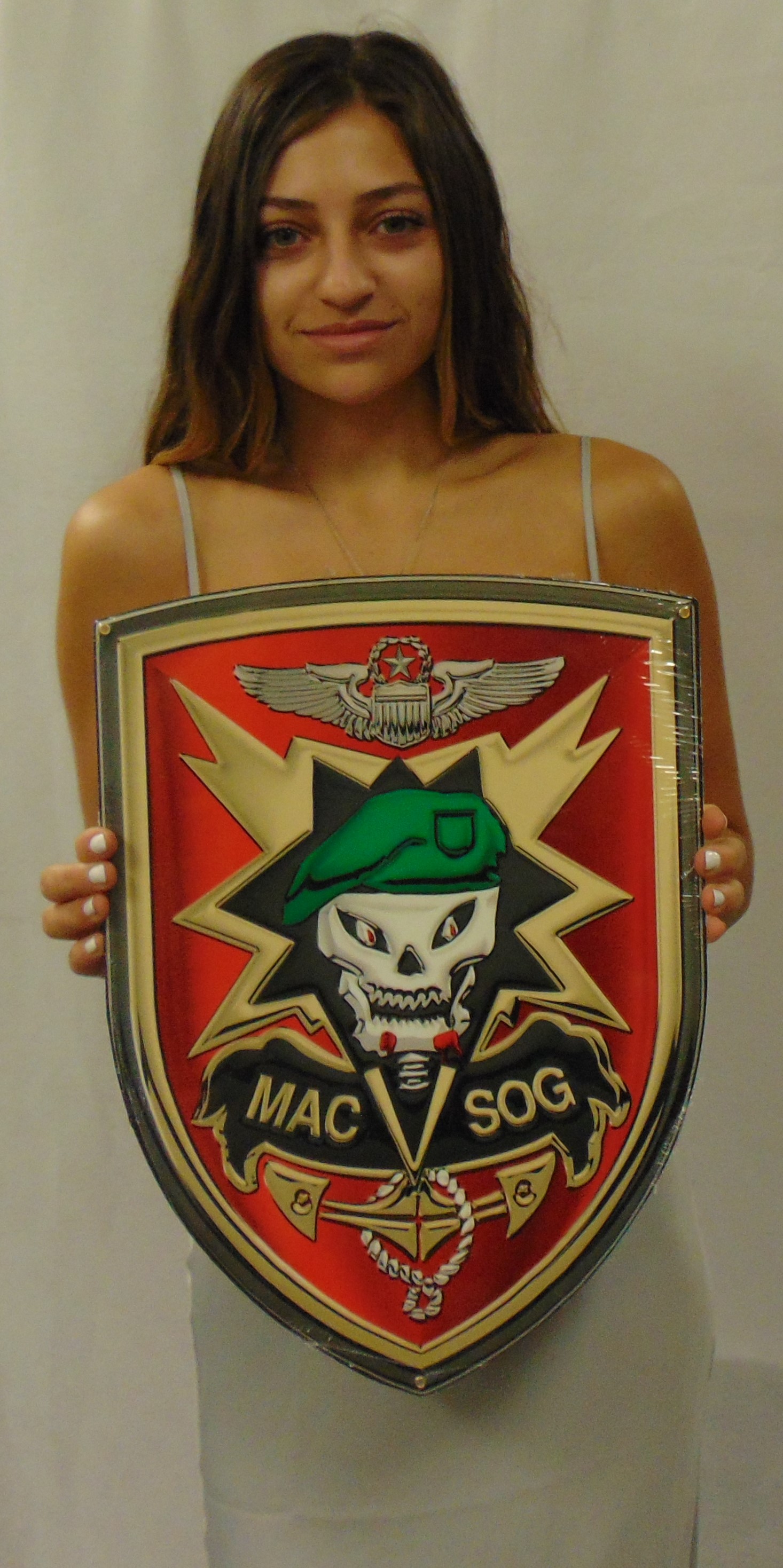 From Special Operations Group, presented by "Military Insignia 3D" collection by Serge Averbuk, MACVSOG 18 x 12" all Metal Sign. This custom metal shape is hand made in the USA using heavy gauge American steel and a process known as sublimation, where the image is baked into a powder coating for a durable and long lasting finish. This custom metal shape is drilled and riveted for easy hanging.