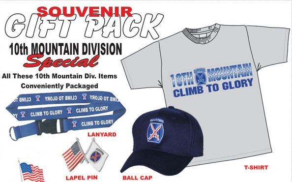 Army 10th Mountain Gift Pack Includes Grey Silk Screened Tee with Metal Look Logo Embroidered Ball Cap Lanyard and Lapel Pin
