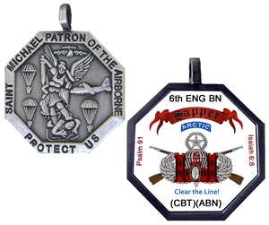 Back of Medal: Saint Michael Patron of Paratroopers, "Protect Us"