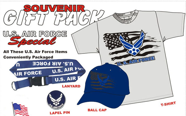 Air Force Tattered Flag Gift Pack Includes Grey Silk Screened Tee with Tattered Flag and Wing Logo Embroidered Ball Cap Lanyard and Lapel Pin