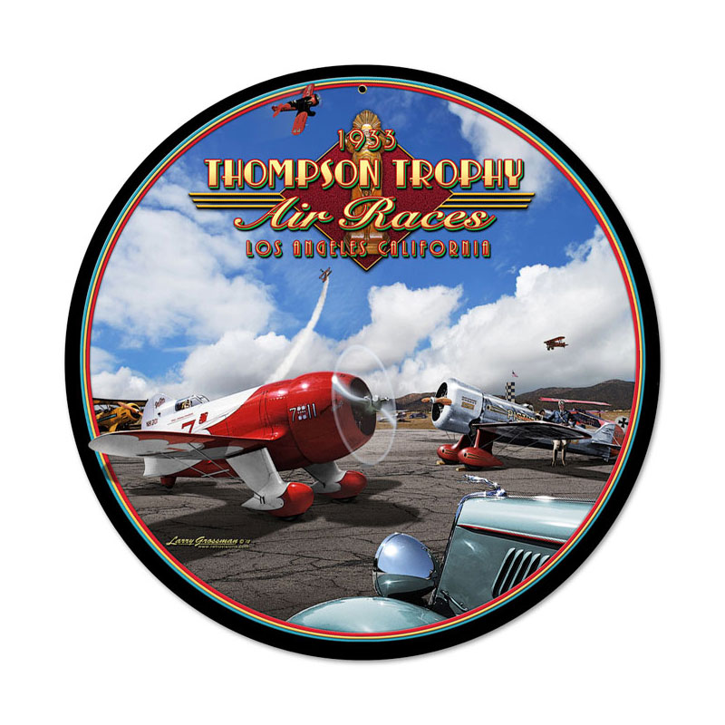 From the Larry Grossman licensed collection, this Air Races 1933 round metal sign measures 28 inches by 28 inches and weighs in at 7 lb(s). We hand make all of our round metal signs in the USA using heavy gauge american steel and a process known as sublimation, where the image is baked into a powder coating for a durable and long lasting finish. This round metal sign is drilled and riveted for easy hanging. ng.