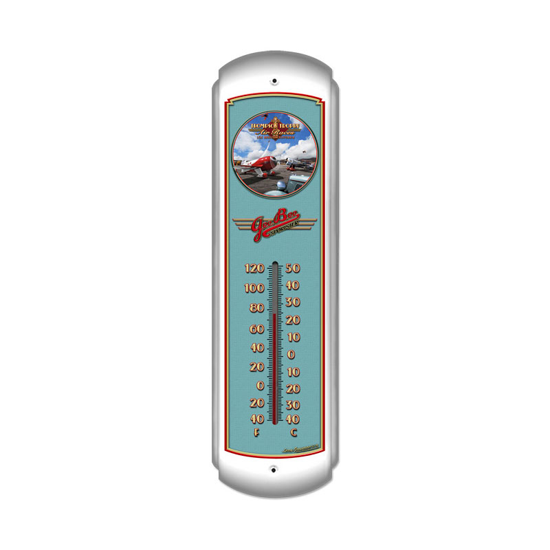 From the Larry Grossman licensed collection, this Air Races thermometer measures 5 inches by 17 inches and weighs in at 1 lb(s). We hand make all of our thermometers in the USA using heavy gauge american steel and a process known as sublimation, where the image is baked into a powder coating for a durable and long lasting finish. This thermometer is drilled and riveted for easy hanging.