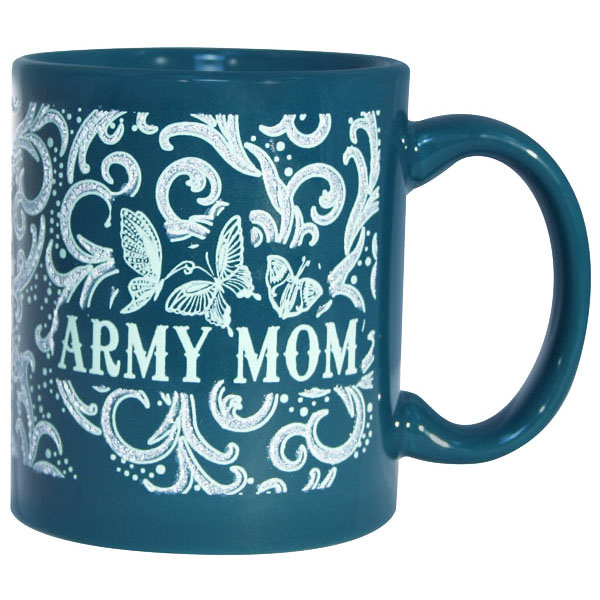Army Mom (Scrolls with Butterflies) Purple Ceramic Mug Teal