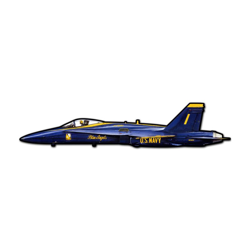 This Blue Angels custom metal shape measures 42 inches by 10 inches and weighs in at 6 lb(s). We hand make all of our custom metal shapes in the USA using heavy gauge american steel and a process known as sublimation, where the image is baked into a powder coating for a durable and long lasting finish. This custom metal shape is drilled and riveted for easy hanging.
