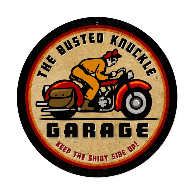 From the Busted Knuckle licensed collection, this Retro Rider round metal sign measures 28 inches by 28 inches and weighs in at 7 lb(s). We hand make all of our round metal signs in the USA using heavy gauge american steel and a process known as sublimation, where the image is baked into a powder coating for a durable and long lasting finish. This round metal sign is drilled and riveted for easy hanging.