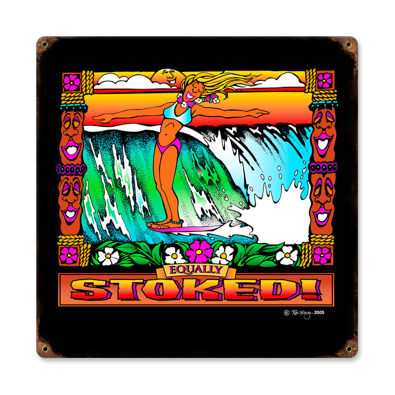 From the Ron Berg licensed collection, this Equally Stoked vintage metal sign measures 12 inches by 12 inches and weighs in at 1 lb(s). We hand make all of our vintage metal signs in the USA using heavy gauge american steel and a process known as sublimation, where the image is baked into a powder coating for a durable and long lasting finish. We then perform a vintaging process by hand to give this tin sign a more retro and nostalgic look and feel. This vintage metal sign is drilled and riveted for easy hanging.