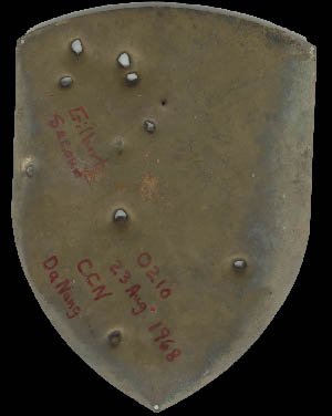 This is the story of the plaque above as told to me by my father, S-2, Paul A. Christensen. Within the compound, a young Vietnamese boy lived. SOG personnel called him "Spike". Spike was the mascot of the camp, he was dressed in GI uniforms and lived among the men. While going through the burned out rubble, Spike came across this FOB #4 plaque. He walked up to my father, Paul Christensen and with sadness in his eyes, shaking his head gave it to him, (Paul). The holes in it are from NVA - AK-47 or CAR-15, M-16 rounds as well as bomb fragmentation. The burn marks are from the fires that erupted after the explosions.