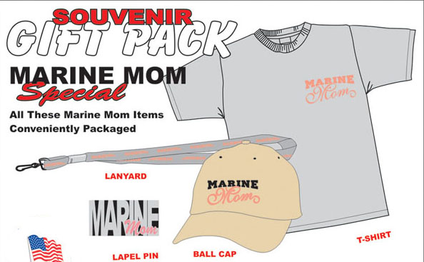 Marine Mom Gift Pack Includes Grey Silk Screened Tee with Script Mom Lettering Pink Imprint Embroidered Ball Cap Lanyard and Lapel Pin