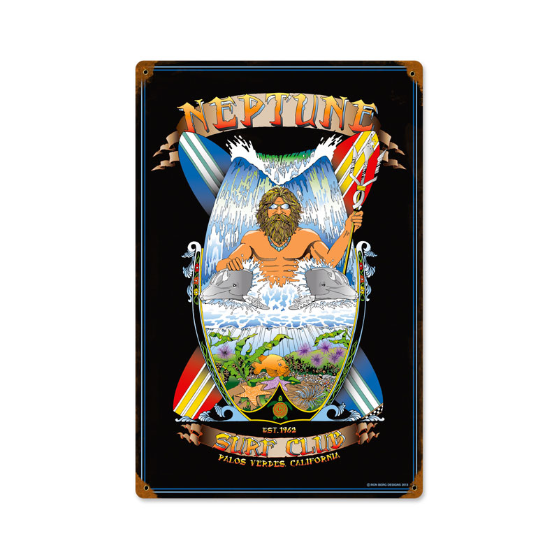 From the Ron Berg licensed collection, this Neptune Palos Verdes vintage metal sign measures 12 inches by 18 inches and weighs in at 2 lb(s). We hand make all of our vintage metal signs in the USA using heavy gauge american steel and a process known as sublimation, where the image is baked into a powder coating for a durable and long lasting finish. We then perform a vintaging process by hand to give this tin sign a more retro and nostalgic look and feel. This vintage metal sign is drilled and riveted for easy hanging.