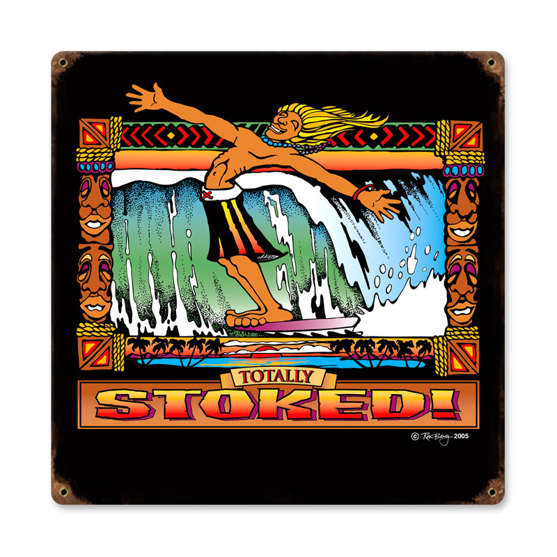 From the Ron Berg licensed collection, this Stoked vintage metal sign measures 12 inches by 12 inches and weighs in at 1 lb(s). We hand make all of our vintage metal signs in the USA using heavy gauge american steel and a process known as sublimation, where the image is baked into a powder coating for a durable and long lasting finish. We then perform a vintaging process by hand to give this tin sign a more retro and nostalgic look and feel. This vintage metal sign is drilled and riveted for easy hanging.