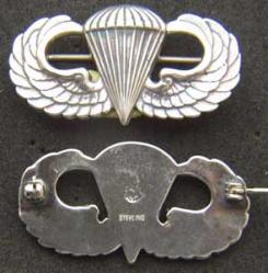 This is a museum quality reproduction of a very rare version of the WWII Paratrooper badge of the Vanguard Eagle hallmarked badge in a pin back in sterling silver.