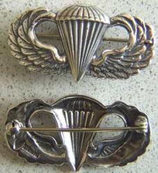 This is a museum quality reproduction of a World War II Paratrooper Badge. This is a copy of a very early design made by NS Meyer with a hollow back, not found in most of the jump wings. This paratrooper badge was one of he first made for the Army. This badge has a pin back.