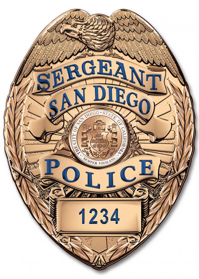 San Diego Police (Sergeant) Department Badge All Metal Sign (With Badge Number) 16" x 16" This custom metal shape is hand made in the USA using heavy gauge American steel and a process known as sublimation, where the image is baked into a powder coating for a durable and long lasting finish. This custom metal shape is drilled and riveted for easy hanging. We do not stock signs as that would be too costly to store, we begin the process of making your sign or clock after your order is confirmed! Our sublimation process takes approximately 7 - 30 business days to complete.