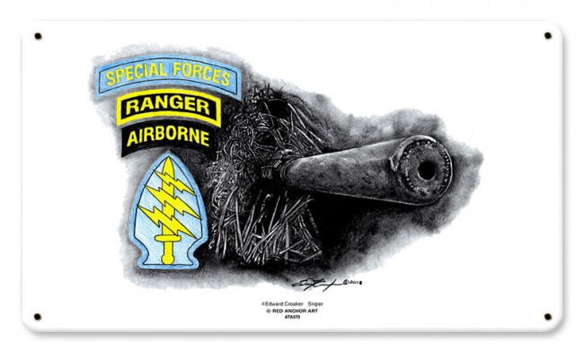 Special Forces Sniper by Red Anchor Art Metal Sign measures 14 inches by 8 inches and weighs in at 3 lb(s). This custom metal shape is hand made in the USA using heavy gauge American steel and a process known as sublimation, where the image is baked into a powder coating for a durable and long lasting finish. This custom metal shape is drilled and riveted for easy hanging.
