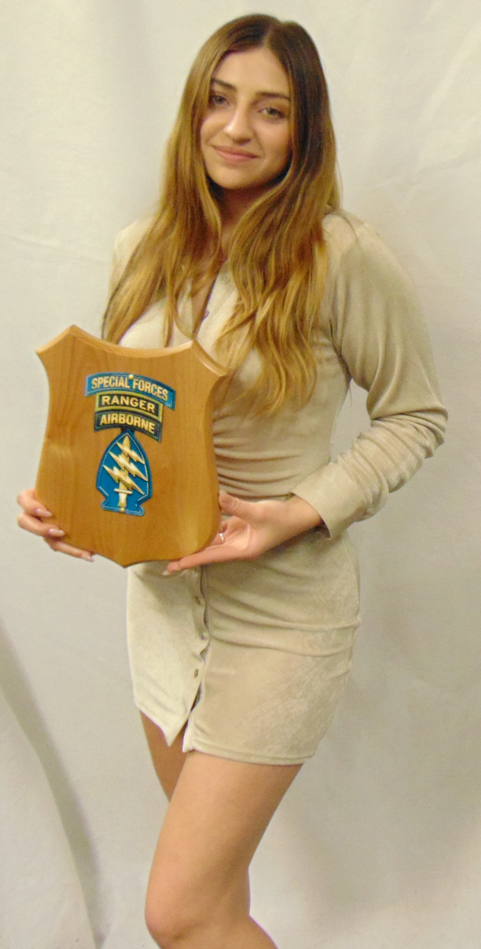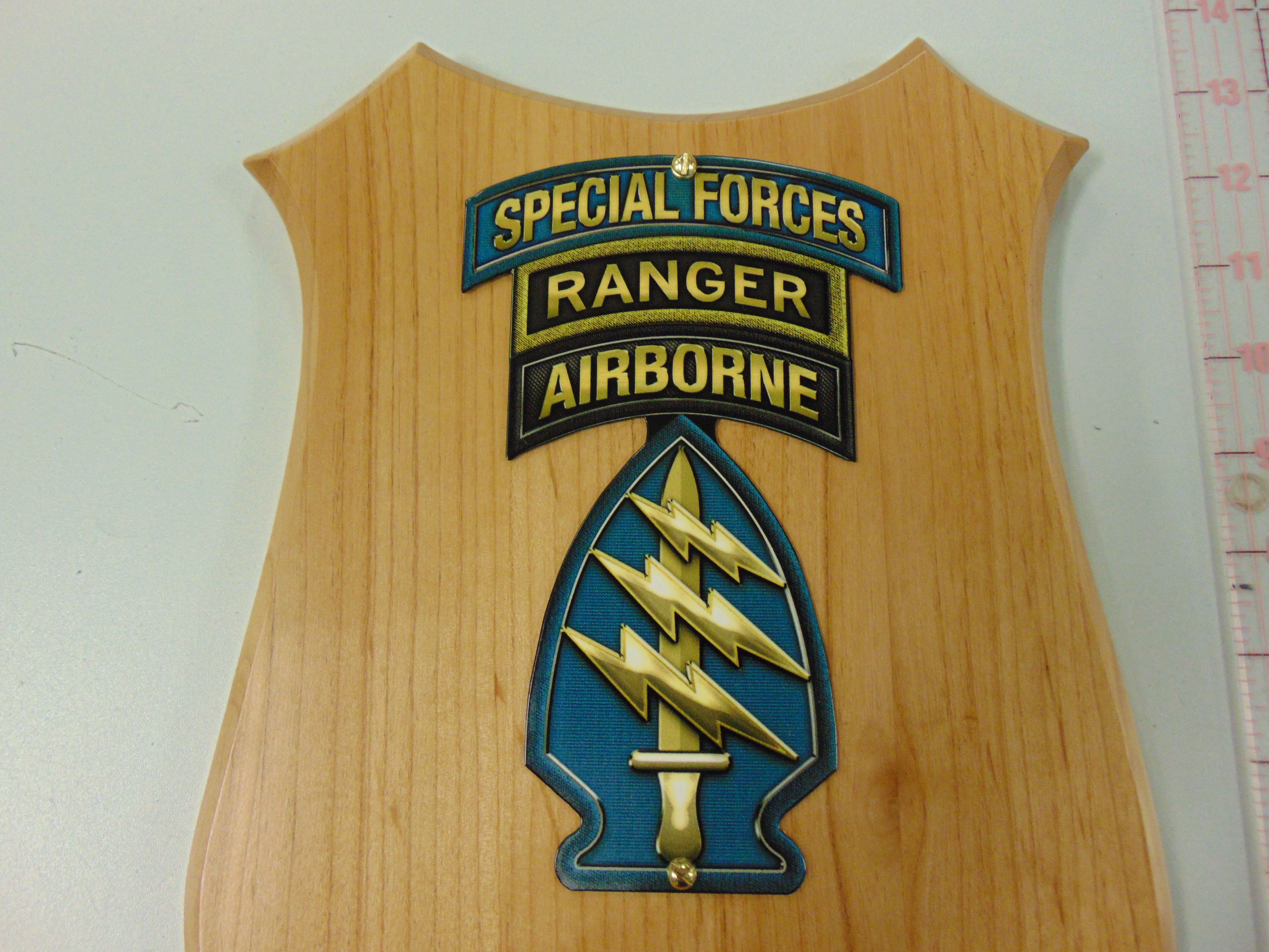 From Special Operations Group, presented by "Military Insignia 3D" collection by Serge Averbuk, Special Forces SSI Airborne, Special Forces Ranger Tabs Wooded Plaque with Your Engraving Information.