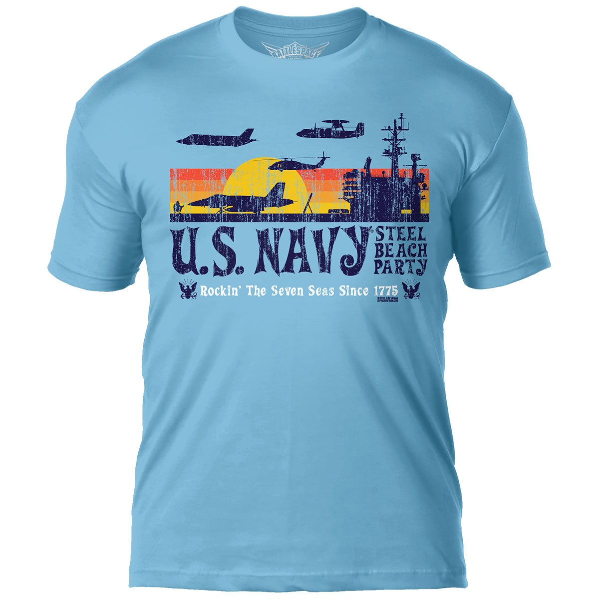 This Navy t shirt is stylized after classically themed beachwear and combined with elements of a Navy carrier flight deck to put a new spin on our idea of a good time! Bring all your friends to this party – especially your friends with guns! The perfect style for any Sailor.