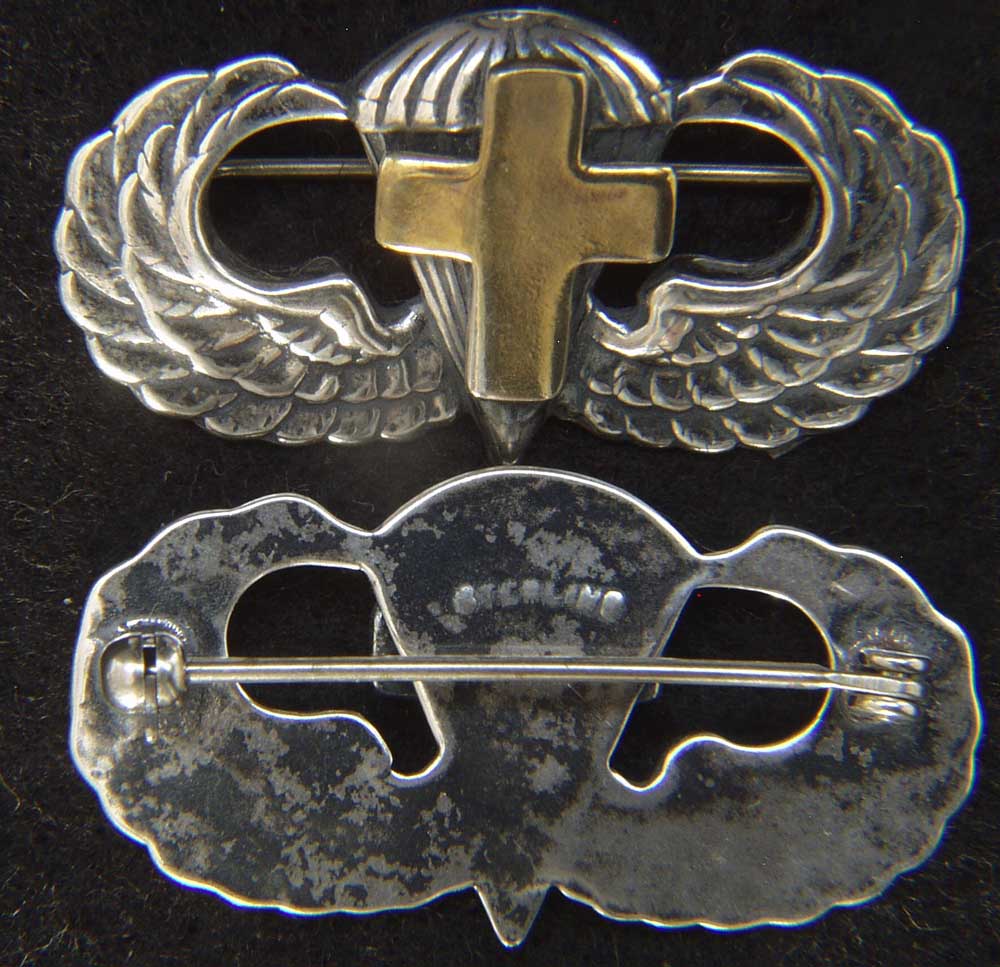 This is a museum quality reproduction of a World War II Christian Chaplain Paratrooper Badge. The cross on this badge is called the Latin Cross. This reproduction is sterling but the cross is a 24 karat gold plate. This badge is a very nice filler until a real one can be found or if you are a reenactor this is the perfect answer.