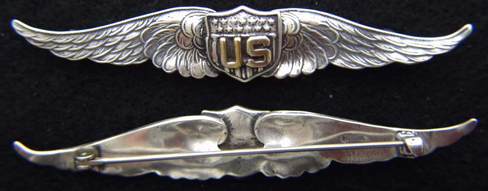 This is a museum quality reproduction of a WWI Pilot Wing in sterling silver with the US letters gold plated that is 3 7/16 inches wide which is rather large for a wing not on a cloth back.