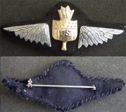 This is a museum reproduction of an extremely rare WWI wing. Talk about ultra rare, this is it. You cant even find pictures of this one in most of the books. They just dont exist. 3 3/4 inches wide. The only pictures seem to be ads from WWI selling the wings. Most pilots just wore their standard Pilot wings and very few spent the extra dollar to get these. Most wings were jeweler designed and not official. The pursuit pilot wing is the rarest of all WWI wings. This reproduction is made with sterling silver wings and the center section in Brass. The wings are attached to a brass plate and wool is properly placed between the wings and the plate and then hand sewn. This reproduction is totally handmade as were the originals.