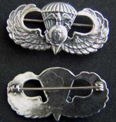 This is a museum quality sterling silver reproduction of a World War II Paratrooper Badge with an USMC EGA attached pin back based on an AE design. A marine upon completion of jump school is awarded the standard Army Paratrooper badge until they have completed their fifth jump for the USMC Badge. Of course some Marines would not wear an Army badge so I am sure this was made to show they were a Marine and proud of it.